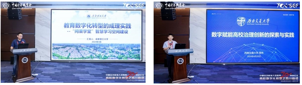 随后,四川三所高校代表分享了在信息化建设与数字化转型方面的实践经验。成都理工大学网络与信息化处岳焱副处长详细介绍了学校在智慧学习空间建设方面的创新举措,包括利用大数据、人工智能等技术提升教学质量和效率的具体案例。西南交通大学信息化与网络管理处周伟副处长分享了学校在数字治理方面的探索与实践,展示了数字化技术在优化管理流程、提高决策效率方面的显著成效。