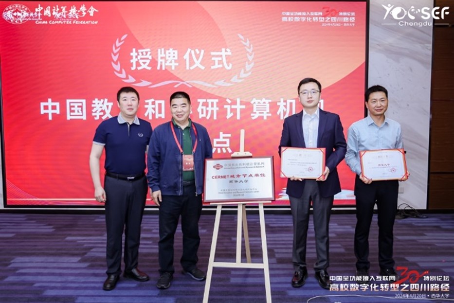 会议期间还举行了中国教育和科研计算机网(CERNET)城市节点授牌仪式,标志着西华大学(宜宾)城市节点正式开通。中国教育和科研计算机网核心节点主任、电子科技大学信息中心主任任立勇教授和赛尔网络有限公司四川分公司总经理刘灿共同为节点揭牌,任立勇主任围绕此次会议主题中国全功能接入互联网30周年发表讲话,他回顾了CERNET的发展历史及其之于中国互联网的历史意义,并表示西华大学城市节点的建设,对推动信息化建设、资源共享及区域性教育信息化平台建设具有重要意义,将为数字化转型发展注入新动力。