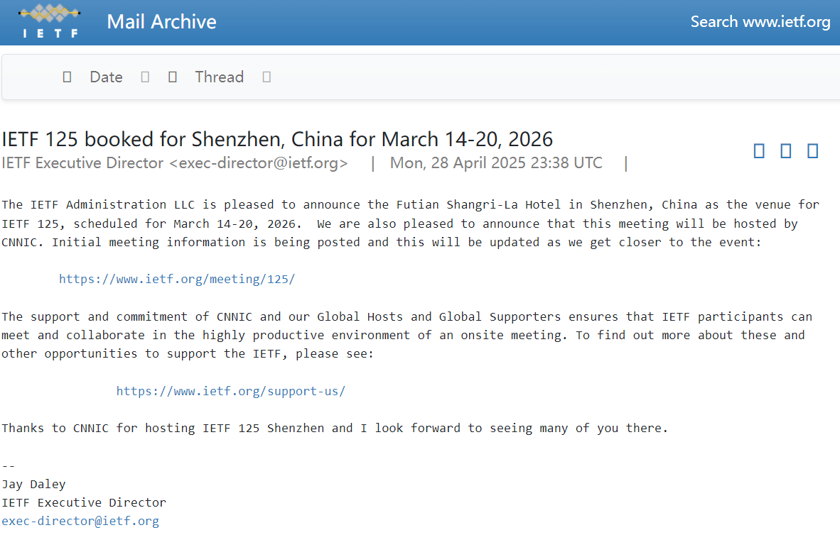 4月28日,国际互联网工程任务组IETF宣布,第125次会议将于2026年3月14日~20日在中国深圳举行。此次会议由中国互联网络信息中心(CNNIC)主办。会议初步信息已发布,并将于会议临近时更新。据悉,届时将有约1000名研究人员参会,其中外籍技术专家约800人。