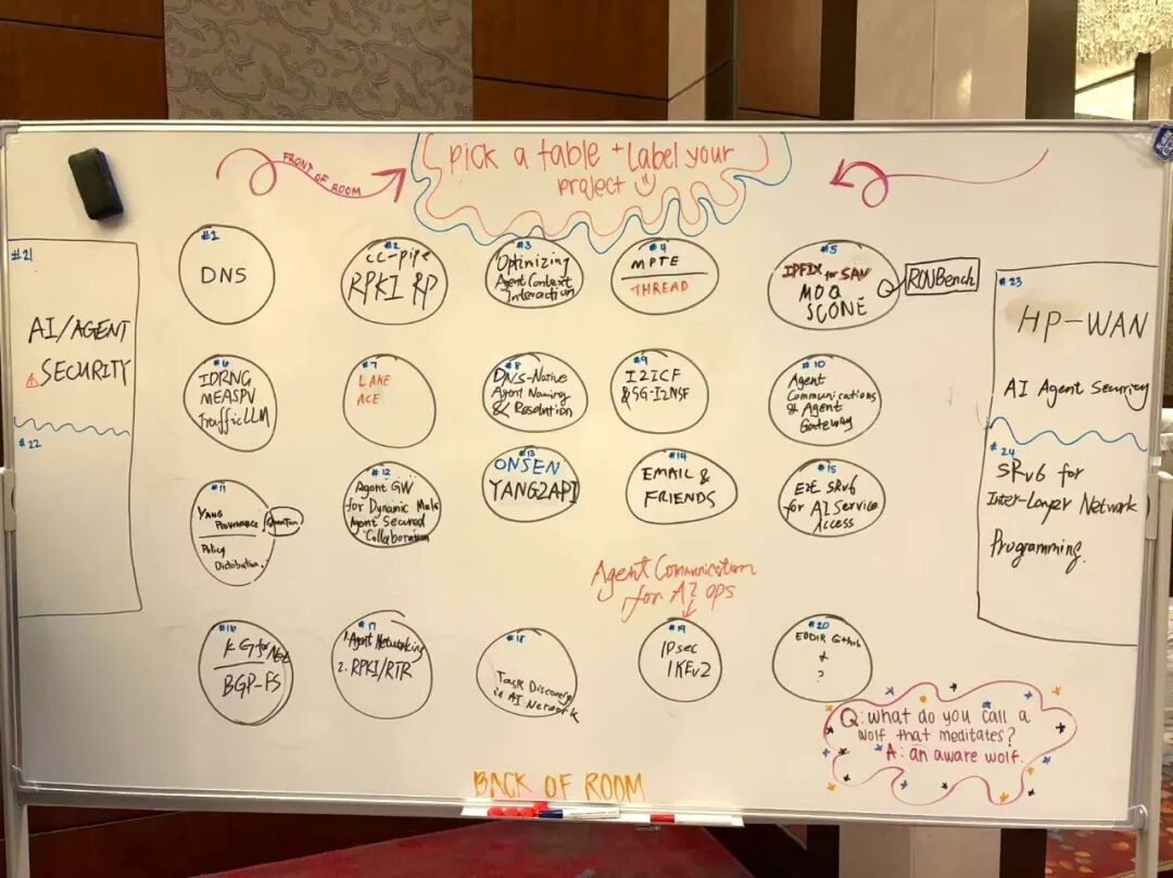 黑客马拉松采取自由组队的形式,现场形成不同领域的小组,本次的小组有DNS、AI和智能体安全等。参与者可根据自己正在开发的代码选择相应的小组,同一小组成员围坐在一张圆桌前,桌上放置白板供参与者进行交流和信息共享,远程参与者也可通过线上参与。