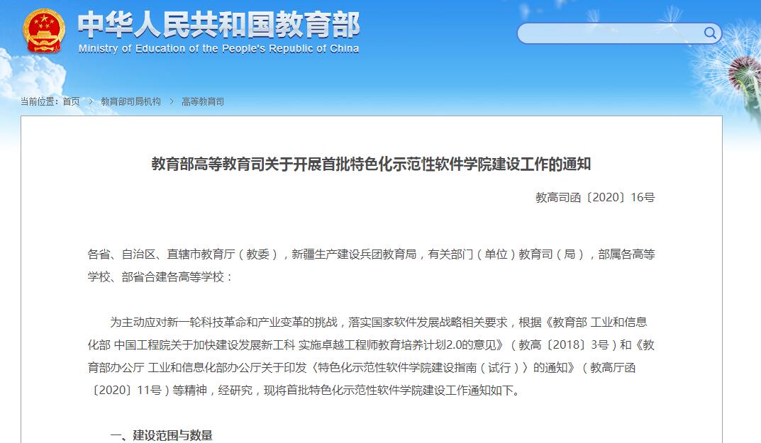 日前,根据相关意见通知等文件精神,经研究,教育部高等教育司下发通知,启动开展首批特色化示范性软件学院建设工作。