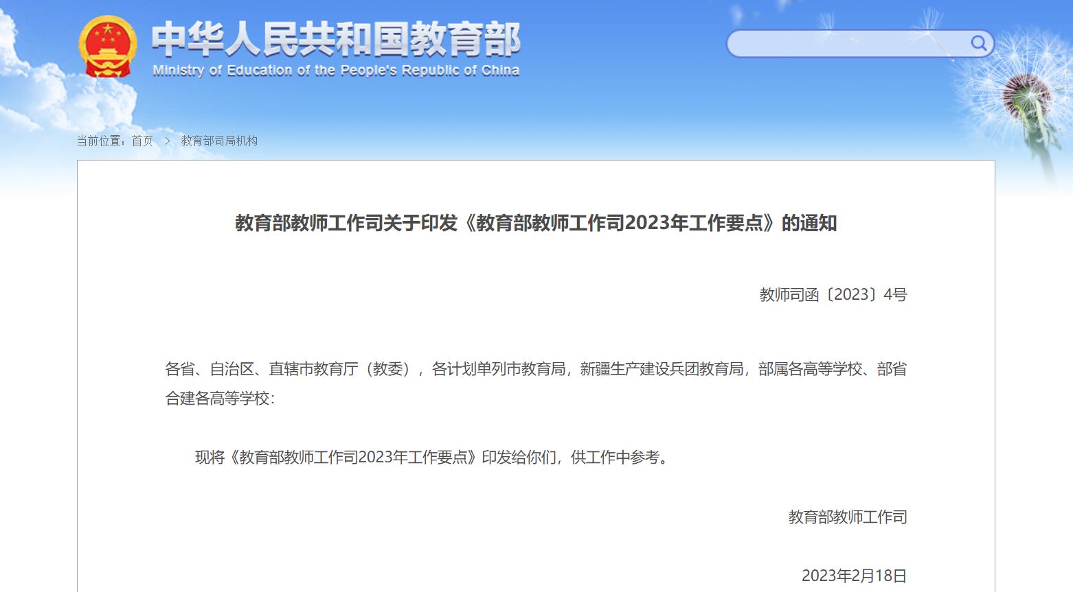 日前,教育部网站公布《教育部教师工作司2023年工作要点》。