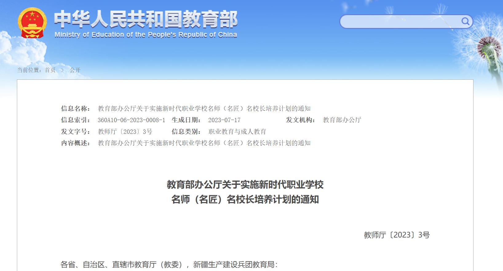 教育部办公厅关于实施新时代职业学校名师(名匠)名校长培养计划的通知