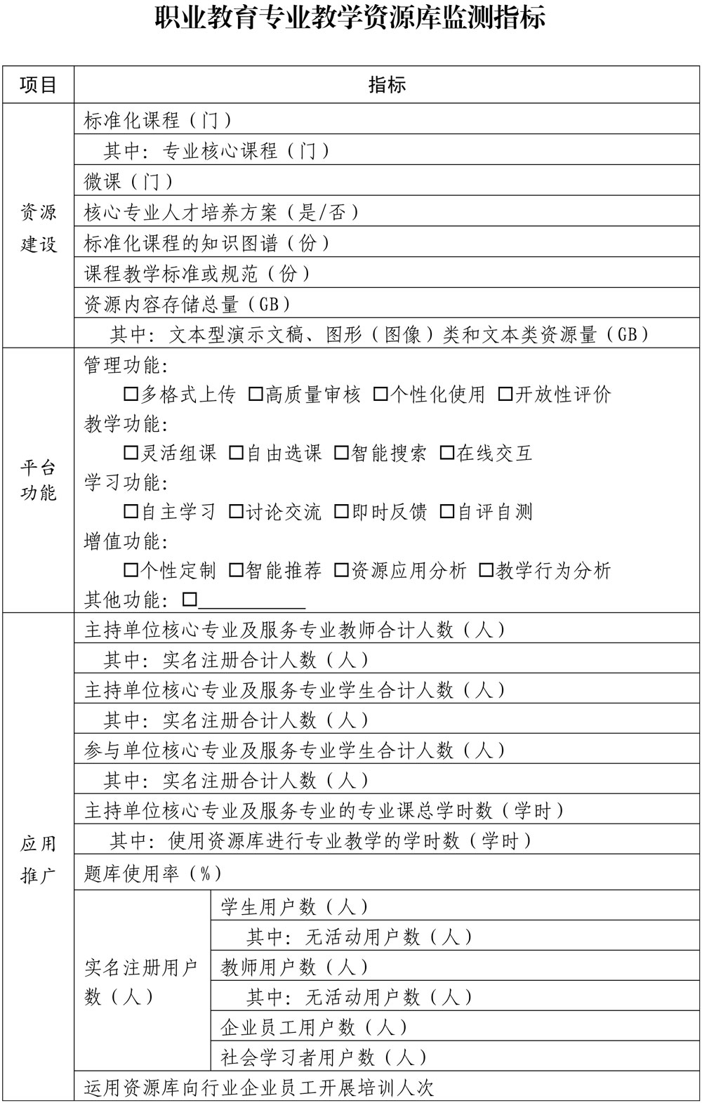 1.资源建设方面,既关注资源库建设内容的完整度和架构的系统性,也关注资源建设的数量、质量、更新情况。资源的数量方面关注课程门数、数字资源量等;质量方面关注资源的政治性、科学性和丰富性;更新方面关注资源的更新频率和新技术、新工艺、新规范引入情况。