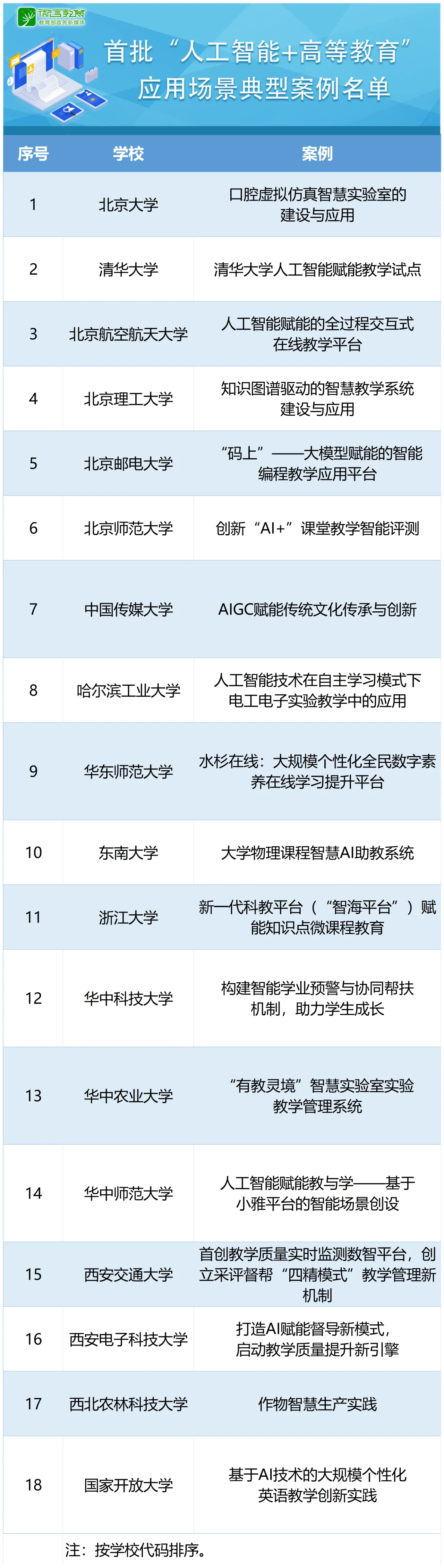 近日,教育部发布通知,公布第二批32个“人工智能+高等教育”应用场景典型案例。此前在今年4月,教育部公布了首批18个“人工智能+高等教育”应用场景典型案例,并于6月启动第二批“人工智能+高等教育”典型应用场景案例征集。这次公布的名单有哪些案例入选?一起来看——