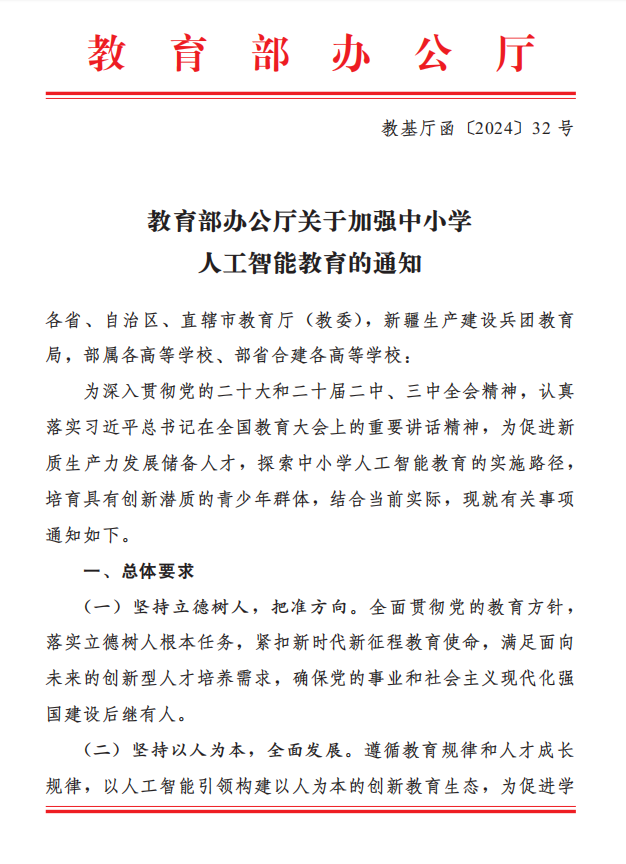 通知强调,要加强顶层设计和部门协同,统筹推进中小学和大学人工智能教育一体化发展,2030年前在中小学基本普及人工智能教育。