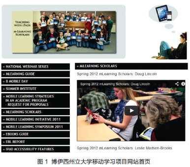 美国博伊西州立大学的移动创新项目是多个项目的集合体,整个项目始于2010年秋季,由教育教学中心和信息技术办公室领导的利用技术进行教学和学习任务小组负责实施,项目要求发展一系列的基于技术的跨校园创新建议,网站首页如图1所示。具体实施的典型项目包括移动学习“m-Learning”学者计划、图书馆/护理部电子学习项目和大学移动图书馆。