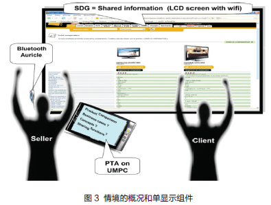 法国里尔大学的Derycke教授的团队开发了一个叫做个人培训助理(PTA)的系统,用来探索利用普适计算技术和设备,根据不同的情境提供动态的信息内容和服务,如图3所示。该系统将移动设备和SmartSpaces(传感器如RFID标签和蓝牙设备)结合起来,用于支持在商店、超市这些公共场所里有特定音响/视频区域内开展学习活动。