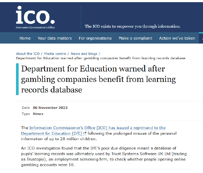 LRS数据库记录了儿童和青少年的出生数据、个人学习和培训成就、电子邮件地址和国籍的可选字段等。2018年9月至2020年1月期间,交易名为Trustopia的公司访问了该数据库,并对22000名学习者进行了年龄验证的搜索。ICO经调查发现,Trustopia实际上是一家筛选公司,并将数据库用于年龄验证,帮助一些赌博公司确认客户是否超过18岁。对此,ICO在谴责中表示: