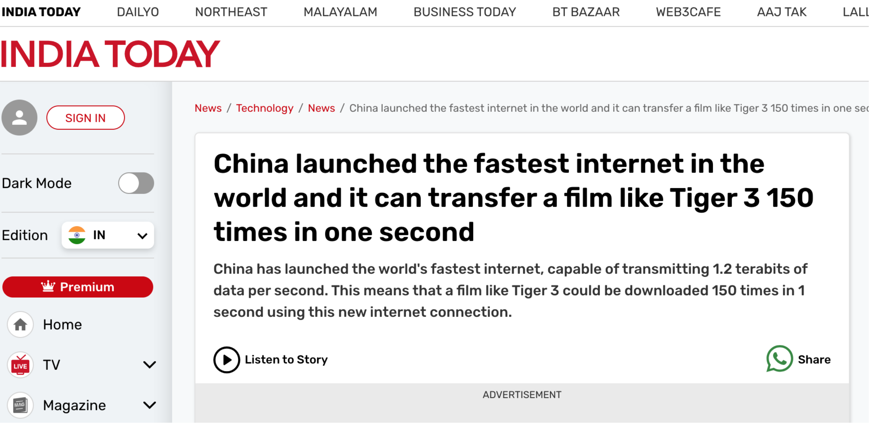 印度影响最大的英文杂志《今日印度》(India Today)发布题为《中国开通了世界上最快的互联网,一秒钟可以传输Tiger3这样的电影150次》的报道。