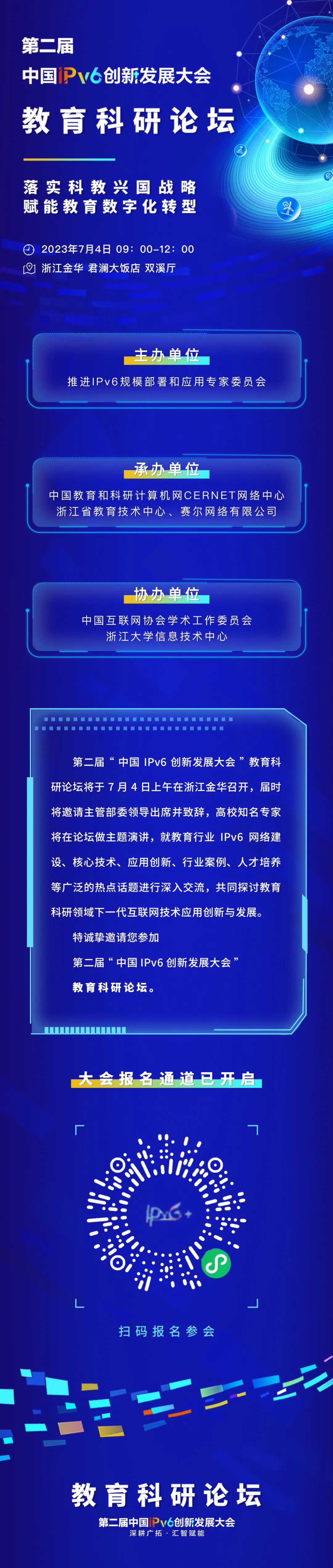 其中,为加快推进教育系统IPv6规模部署与应用,由中央网信办等部委指导,推进IPv6规模部署和应用专家委员会主办的教育科研分论坛,定于2023年7月4日上午召开。论坛主题为“落实科教兴国战略,赋能教育数字化转型”,将邀请相关部委领导、高校及科研机构知名专家出席作主题报告,就教育系统IPv6规模部署与应用、IPv6赋能教育数字化转型等进行深入探讨。