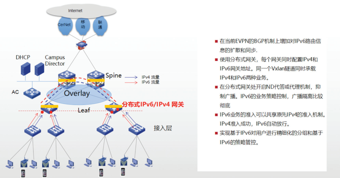 为实现校园网的可运维、更高速和强安全,学校基于SDN网络的IPv6升级改造,将围绕以下目标开展部署实践:一是基于SDN网络实现IPv6业务的自动化部署,二是实现校园网络IPv6接入和访问服务的全覆盖,三是构建更灵活的IPv6安全防护体系,四是探索IPv6的创新应用。