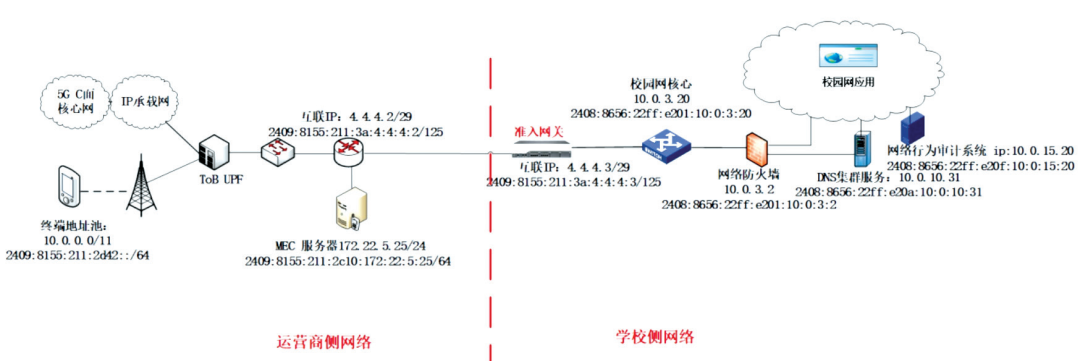 校园5G专网(图2)的设计由学校与运营商协同进行IPv6网络规划,终端手机全面支持IPv6/IPv4双栈网络接入,在运营商侧的MEC服务器和学校侧服务器应用也同时支持IPv6/IPv4双栈访问。