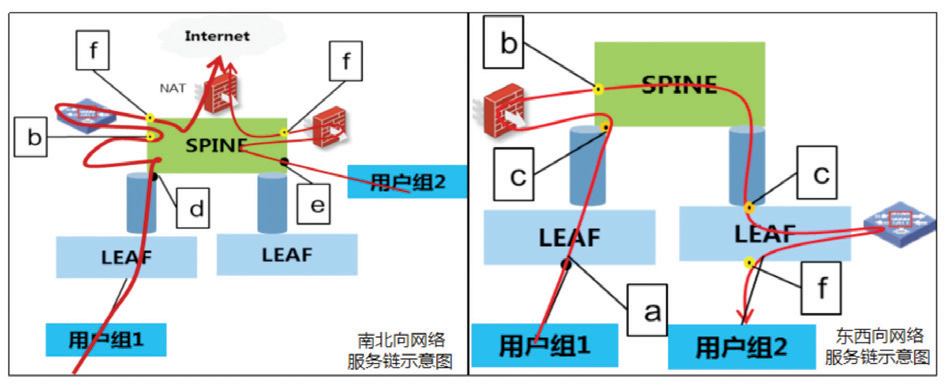 利用SDN网络的微分段功能,可设置基于IPv6南北(东西)向业务流量的服务链,实现IPv6流量的南北(东西)业务流量按需引流到安全防火墙,从而灵活地实现基于IPv6的安全服务链,保障IPv6业务的安全访问。服务链本身也可以做到服务资源弹性扩容,灵活、按需分配(图3)。