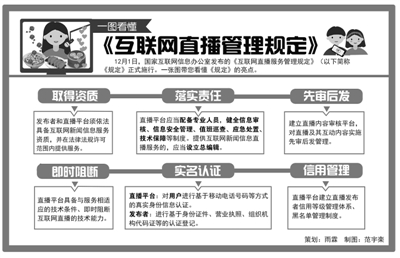 针对网络直播存在的诸多乱象,12月1日起施行的《互联网直播服务管理规定》,对互联网新闻信息服务直播资质、直播平台的内容管理、网络直播信用体系等提出了具体要求。