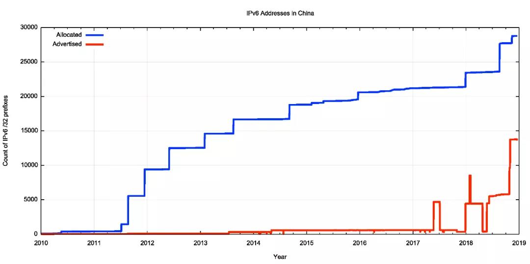 虽然许多地址分配都发生在几年前,但在2017年底之前,在Internet域间路由空间中中国发布的IPv6地址前缀总量一直很小。2017年12月29日,BGP发布地址总量从略低于/24的IPv6地址空间水平跃升至/20。2018年10月下旬,发布地址的总量增加了一倍多,略多于/18的IPv6地址空间。2018年底,分配给中国的IPv6地址空间有略少于一半的地址被BGP发布。