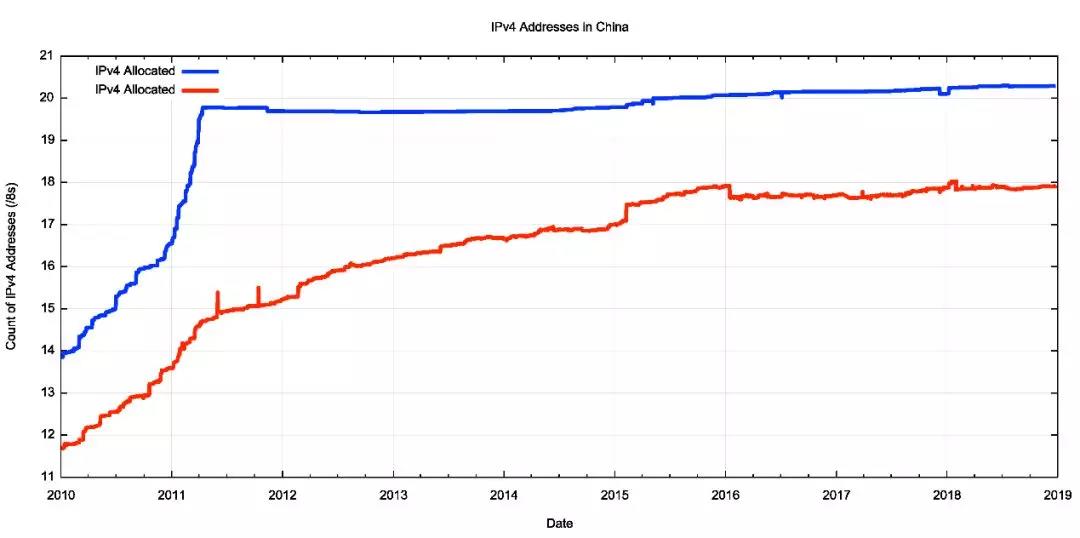 自2016年以来,中国的IPv4地址增长基本上已经停止。在中国,任何IPv4互联网的规模扩张都必须通过各种使用网络地址转换手段(NATs)的地址共享形式来实现。不幸的是,在中国或其他任何国家都没有关于NAT使用的公开数据,不过用户数量自身也可以来解释数据问题。我们已知在中国大约有3.01亿个IPv4地址服务7.41亿互联网用户。有些用户可能拥有多个联网设备,而另一些用户可能通过共享一个设备连接上网,平均估计中国的设备数量超过10亿个是合理的,这意味着平均IPv4地址共享率约为3个设备/IP地址。