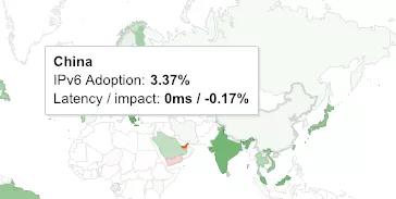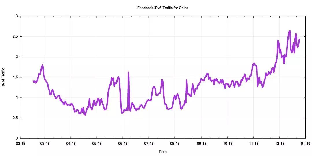 但据报道,Facebook在中国并不普遍可用,因此,对2.4%的IPv6流量的测量可能并不能反映出中国IP基础设施的总体情况。