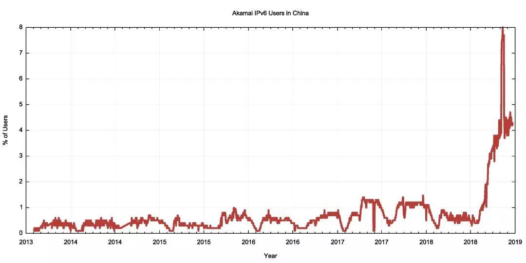 此数据与图1中的IPv6的BGP发布数据时间序列具有一定的相关性,在2018年都有一个非常显著的增长变化。根据数据显示,截止到2018年底,中国的IPv6使用率为4.5%。与Facebook和谷歌在过去几年数据中的比较表明,Akamai可能有拥有比使用谷歌和Facebook更大的测量对象,这也使得2018年中8%使用率的峰值更加令人好奇。