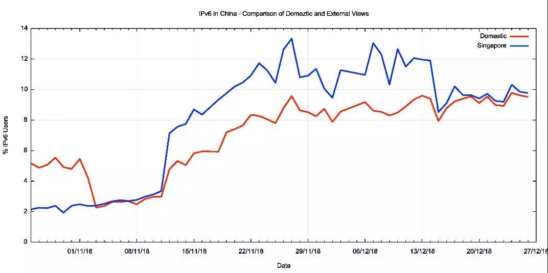 图中两条曲线在2018年10月底和11月和12月之间的差异可能与新加坡的服务器过载有关,这导致了访问新加坡服务器IPv6 URL的请求数量异常下降。这种情况在12月中得到了解决,此后两个服务器上的IPv6测量结果是一致的。同样有趣的是,本次活动中的两台服务器在12月的最后一周都报告了接近10%的IPv6使用率,比全球大型广告活动的测量结果还高出2-3%。