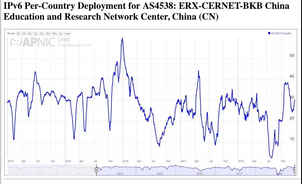 谷歌和Facebook发布的IPv6数据似乎只看到了中国IP基础设施的一小部分,而使用VPN访问这些服务很可能会使这一部分数据受到影响。来自Akamai的统计与我们基于APNIC广告的测量计划中看到的数据一致。在中国,IPv6的使用已经发生了大规模的变化,从11月开始,在这些大规模的服务网络中,显示出了很多明显地向IPv6迁移的迹象。