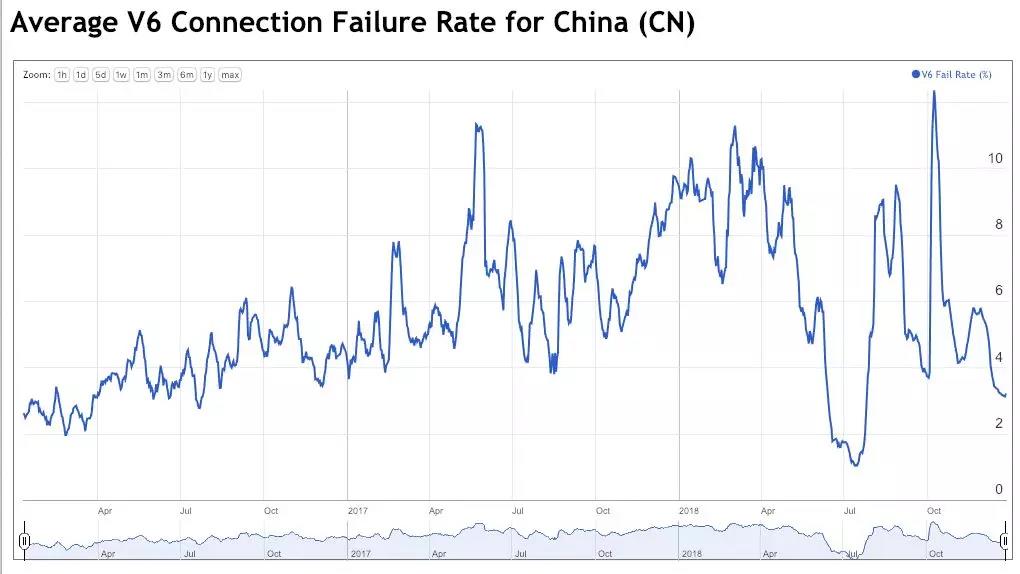 互联网的平均IPv6连接失败率约为1%,因此即使中国最近的IPv6连接失败率降到3%,也远高于全球平均水平。平均值隐藏了不同网络连接失败率的变化,一些中国网络IPv6连接失败率非常高。其中最高的是中国联通广东分公司的AS 134543网络,根据数据统计,该网络的连接失败率高达IPv6连接尝试的60%。中国最大的网络ChinaNet(AS 4134),拥有1500万个IPv6客户端,连接失败率统计为4%。这意味着有60万用户正在体验到IPv6连接丢失,这是一个非常高的失败率。