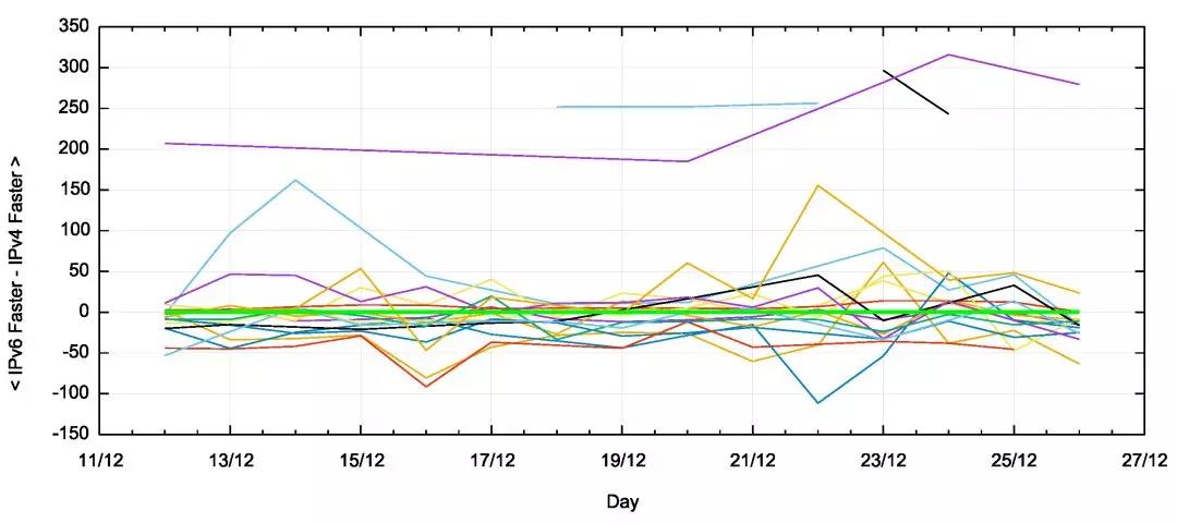 中国的内部IPv6路由管理表现得很好,往返时间的平均差异表明,IPv4和IPv6的路由路径处理大致相同,如图19所示。