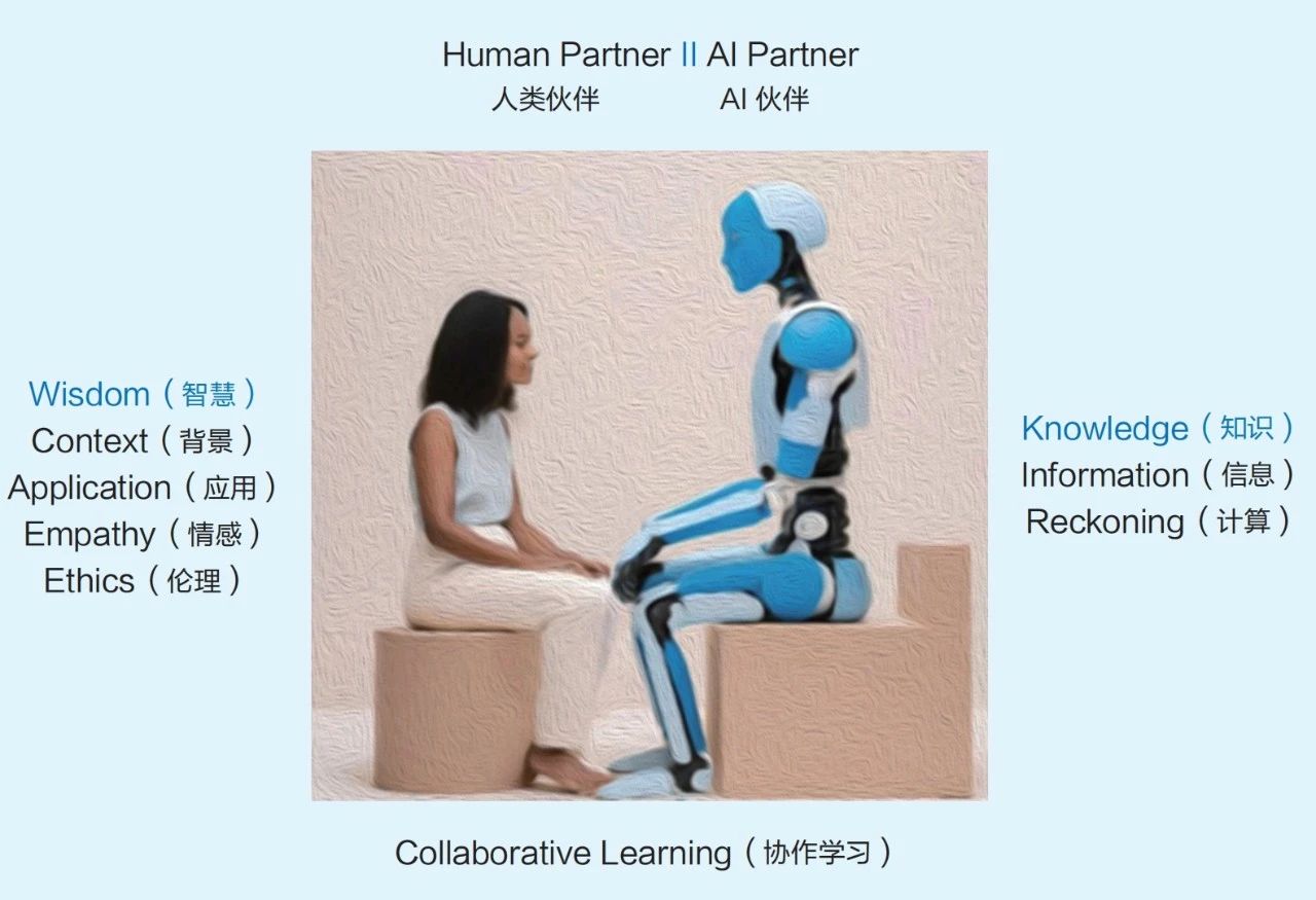 新一代人工智能学习者需要深刻理解知识(knowledge)与智慧(wisdom)之间的细微差别(图1)。利用人工智能工具对“知识”进行处理,而人类则需要在批判性思维和应对道德挑战方面表现出更强的“智慧”。