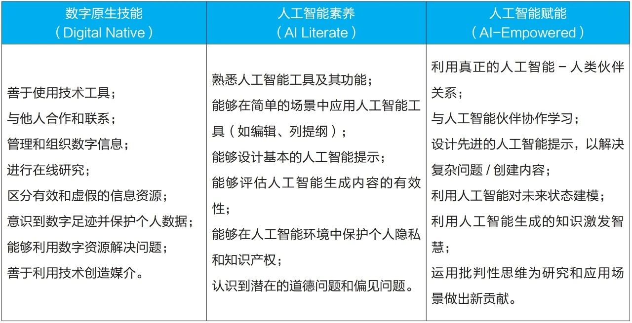 在人工智能时代,数字原生技能仍然是必要的。此外,学习者还需要具备更多的人工智能素养,才能在未来的职场中取得成功。这些人工智能素养技能必须被纳入所有阶段的课程中,因为对学习者来说,人工智能素养可能最终会变得与阅读和写作一样重要。为了进一步消除数字鸿沟,教育工作者将需要越来越多地倡导促进数字公平的举措,确保可访问和适应性。最终,当学习者从人工智能素养过渡到“人类-人工智能”合作模式时,人工智能才能真正赋能(图2、表1)。