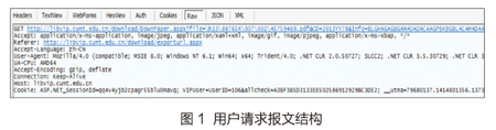 针对文献获取行为,利用Fiddler软件,我们进行了报文截取和分析。一个典型的下载请求如图1所示。