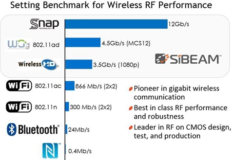 目前,IEEE(国际电工电子工程学会)已核准WiGig成为新的802.11ad 制度规范,802.11ad 协议的最高传输速度在7Gb/s,而SiBEAM称,目前自己已能领先全球使用标准CMOS技术制造60GHz 芯片配合Snap技术,传输速度已可达12Gb/s。