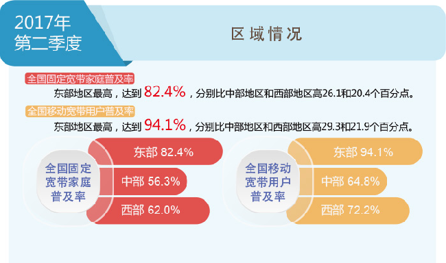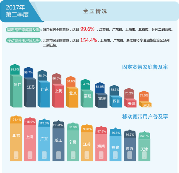 本期《报告》还显示,从区域的宽带发展普及状况看,固定宽带家庭普及率和移动宽带用户普及率东部地区大幅领先,西部地区高于中部地区的格局仍然保持。从各地的宽带发展普及状况看,固定宽带家庭普及率方面,浙江省最高,达到99.6%,排在前五位的地区还有江苏省、广东省、上海市、北京市。移动宽带用户普及率方面,北京市、上海市、广东省和浙江省位列前四,且均超过了100%,排在前五位的地区还有宁夏回族自治区。