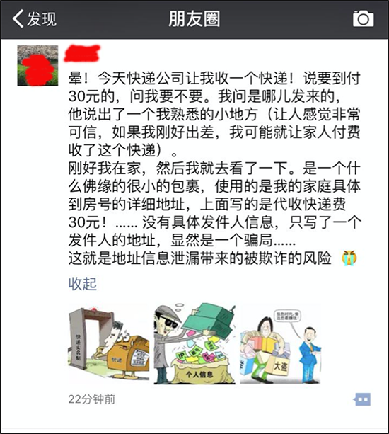 先给大家讲一个故事。下面这个截图来自一个国内知名学者的朋友圈,我给大家介绍一个案例,没有任何主观色彩。这个故事是这样的,这个学者收到一个快递电话,跟他说他有快递,要到付30元。快递小哥说了一个地址,感觉像是真的。这个学者很警觉,去看看快递。但是这个快递是一个很小的包裹,收件人地址是非常精确的,但是寄件人是没有名字的,寄件人的地址也是一个让他觉得非常熟悉的地址,这是一个很显然的快递欺诈的包裹,学者拒收了这个快递。他想着如果不给他打电话,可能让家人去收快递了,因为有非常准确的地址。