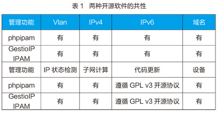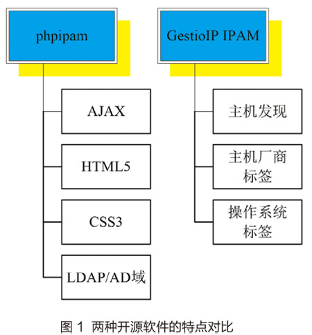 IPAM系统主要是以数据记录、动态展示为主,使用比较灵活的B/S结构,这样可以提高便捷性和满足跨平台使用的要求。作为网络管理员,希望对IP地址管理的同时能够监控到业务系统管理员的操作记录,并支持IPv6、有直观的图表展示、代码持续更新等主要功能,基于这些特点,笔者从著名的sourceforge.net网站上进行了一些筛选,挑出了两个评分较高的IPAM开源软件项目进行对比分析,分别是phpipam和GestioIPIPAM,这两款开源软件除基本功能外,有共性也有各自的特点,表1列出了两种开源软件的共性,图1是它们的特点对比。