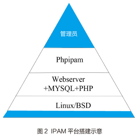 phpipam的开发者是斯洛文尼亚的MihaPetkovsek,sourceforge.net上记录最早于2013年提供了开源代码,是一个基于PHP的优秀Web应用,有着良好的兼容性与通用性,可以搭建各种在发行版的Linux系统甚至是FreeBSD,笔者使用了以稳定著称的Debian平台。选用LAMP经典组合,将Apache、MySQL和PHP等必要组件安装完成后仅占用1.5GB左右的磁盘空间,非常精简,只需要在虚拟机管理端分配0.5~1GB内存、1~2个CPU便可流畅的运行起来了,如果分配20G的磁盘空间,能满足未来多年的需求。Web服务端可使用apache,或轻量级的Lighttpd、nginx,但必须同时都把PHP安装上。图2为IPAM平台搭建示意,本次应用选择的是最流行、用户最多的Apache,因为它对phpipam中启用Prettify links(伪静态)URL时所要用到的mod_rewrite配置比较方便。phpipam功能全面,支持IPv4和IPv6,有内建的IPv4和IPv6子网计算器;支持无类域间路由(CIDR)标记;支持MySQL数据库或xls文件导入/导出;子网嵌套;用户/组权限设定;可视化报表工具;支持设备、VRF和VLAN;电子邮件通知;支持基于LDAP或AD结合的认证。
