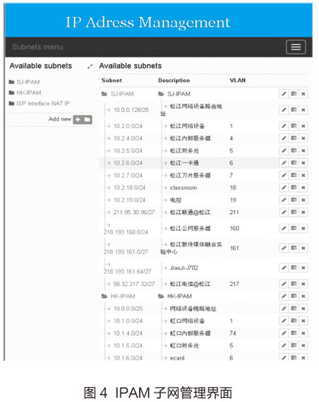 IPAM(IP Address Management)或称IP地址管理,是将网络管理科学应用到互联网协议地址空间及相关联的网络服务,是以聚合方式管理IP地址空间的各项技术和日常IP地址管理功能的管理模式,IPAM在网络环境里的重要性堪比一个城市的规划系统,合理有序地利用有限的IP地址资源,尽量减少及杜绝因为IP地址错误部署、管理而造成的网络或应用中断。如果只有一片区域,IT管理人员也只有一名,那几张Excel表就可以解决问题,但实际在高校信息化领域中,IP地址资源非常庞大,往往会有数百个VLAN,数千个公网IP,数万个内网IP,以及数不胜数的IPv6地址,且多个业务系统管理员会同时访问IP地址资源池,例如网络管理员需要构建新的VLAN、获得新的公网IP;服务器管理员需要给新的服务器和存储系统配置IP地址等,这些需求汇总到一起,就需要有一个专门的管理系统去处理。IPAM的预算优先级比不上重要信息系统的建设和核心网络设备的购置,笔者本着降低成本的原则,以开源软件为基础搭建IP地址管理系统,并进一步实现网络管理员和业务系统管理员的逻辑分级管理、动态数据库查询和实时监控跟踪IP地址分配出去后的状态,进而从根本上提升网络管理工作的效率。