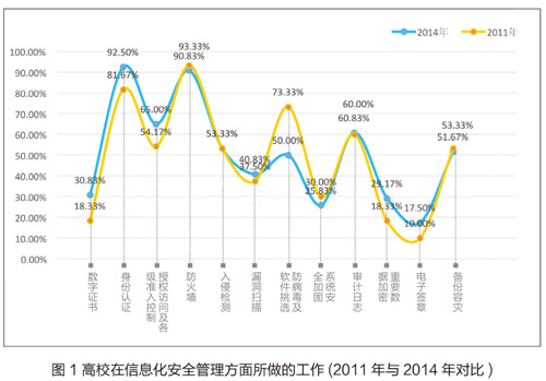 十二五期间,针对全国高校的信息化发展基础状况,教育部科技发展中心进行过两次调研,分别是2011年及2014年。对比两次调研的数据,我们发现了高校信息网络安全的一些发展规律与趋势。