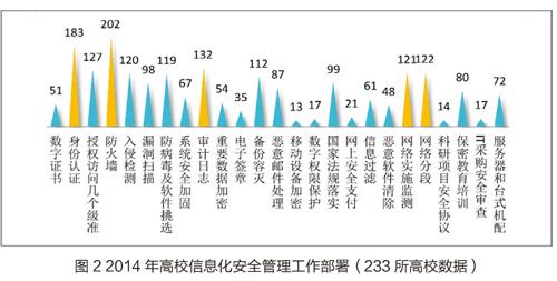 对比2011年与2014年都参与调研的120个高校数据,可以发现,高校在信息化安全管理方面所做的工作,总体上具有一定的沿承性和持续性,但随着外部环境的变化,有一些局部的调整。如图1所示,部署了“数字证书”的学校从2011年的18.33%上升到2014年的30.83%,部署“身份认证”的也从原先的81.67%上升到了92.50%,“重要数据加密”从原先的18.33%上升到29.17%,而“防病毒及软件挑选”(从2011年的73.33%下降到2014年的50%)、“系统安全加固”(从2011年的30%下降到2014年的18.33%)等工作都有相应比例的下降,这说明高校的安全防护措施有了新的发展,与当前高校师生的网络安全防护意识提升、社会上网络安全产品逐渐成熟,并从而减轻学校在局域网管理上的压力有很大关系。与此同时,高校信息安全防护的技术手段也有了许多新的发展,比如“网络分段”、“网络实时监测”、“恶意邮件处理”等,分散了原先仅靠防火墙、防病毒等单一技术手段的压力,如图2所示。