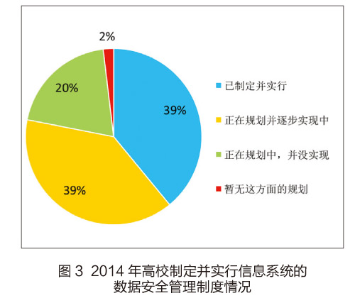 在调研中,2014年高校对完善管理制度有了更多的需求,数据安全意识提升,而且纳入了高校信息化规划,调研数据表明,有98%的学校已经制定信息系统数据安全制度,实行或正在实行该制度的占78%,仅有2%的学校暂无这方面的规划,如图3所示。