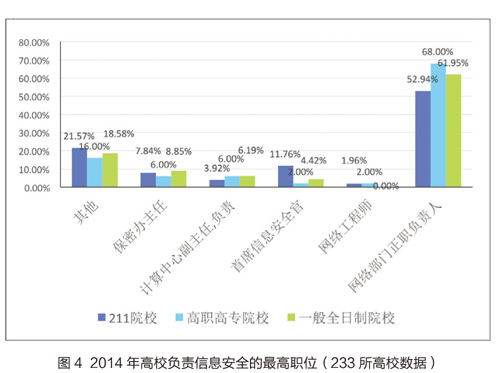 2014年调研数据表明,各类高校大多由网络部门的正职负责人对信息安全直接负责(211院校占52.94%,一般本科院校占61.95%,高职高专占68%),211院校因学校建置及要求原因,呈现出相对多样化的情况,如图4所示。