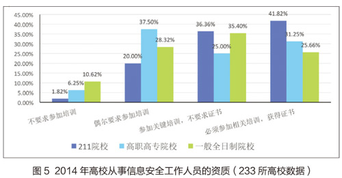 在“高校从事信息安全工作人员的资质”要求上,41.82%的211院校要求相关人员必须参加培训并取得证书,一般全日制本科院校对于信息安全工作人员的资质意识相对淡薄,38.94%的一般全日制本科学校不会参加或偶尔参加相关培训,如图5所示。