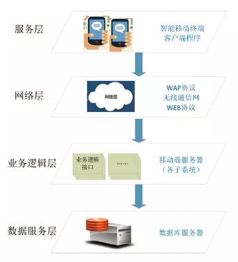 一个良好的设计框架是移动端程序稳定高效运行的底层保障,本项目移动端采用B/S模式进行架构,移动端的体系架构从高到低依次为服务层、网络层、业务逻辑层和数据服务层。