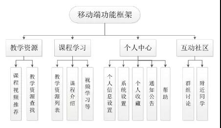 移动端的建设内容主要分为两大部分:移动客户端的后台部分、移动客户端。其中移动客户端分为四大模块,即教学资源查找与浏览、课程学习、个人中心和互动社区,其中每个大模块中又细分为若干小模块。