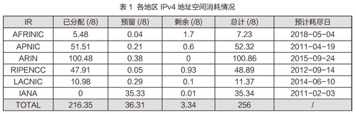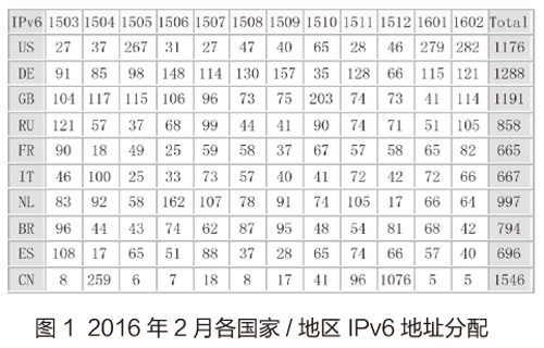 2016年1月全球IPv4地址分配数量为82B。2月全球IPv4地址分配数量为17B,其中获得最多的是美国,4B;其次是印度,2B。2月,除亚太、欧洲、拉美、北美等地区IPv4地址已耗尽外,非洲地区分配照常。各地区IPv4地址消耗情况,参见表1。在过去的12个月,美国获得的IPv4地址最多,共计482B;其次是埃及,81B。