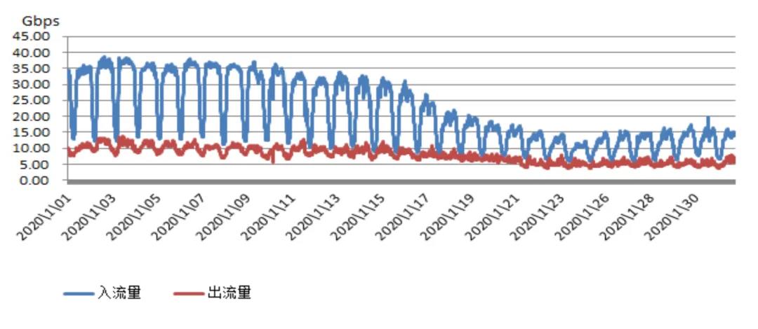 1月CERNET主干网流量相比2019年12月明显下降,主要原因是高校放寒假,学生用户减少。主干网总流量相比于12月减少了91.01G;国内互联互通总流量相比于12月减少了17.78G;国际互联总流量,相比于12月减少了3.86G。