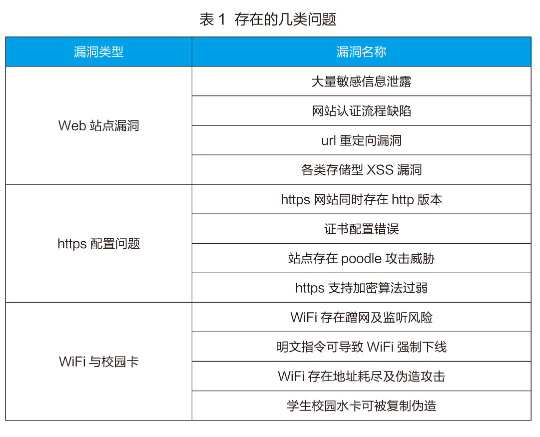 2016年底,我们对北京市某些高校网络进行了安全渗透测试,其内容包括Web站点、服务器配置、无线WiFi接入、校园卡设备等,发现其中存在诸多安全问题,可分为几类,参见表1。