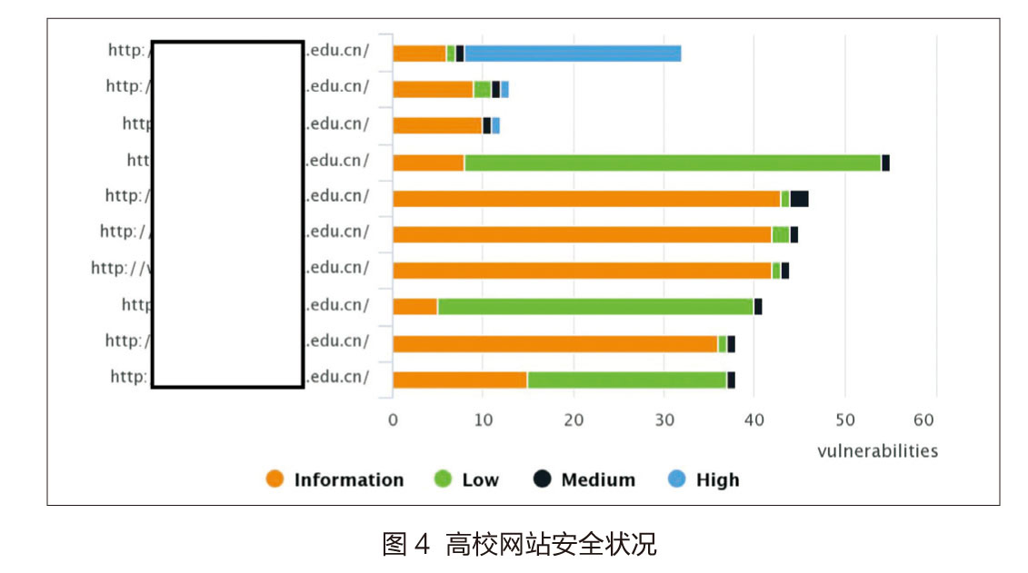对高校网站安全状况进行统计,结果如图4所示。可以看出,大多数网站以信息泄露和低危漏洞为主,也有个别站点安全性较差,存在多个高危漏洞。
