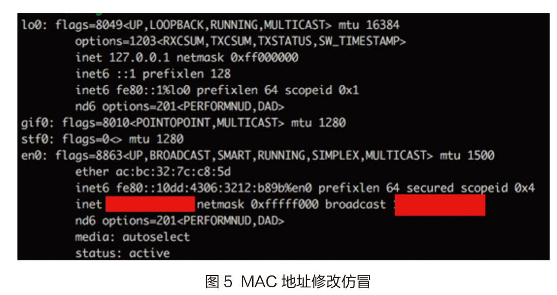 校园网WiFi服务是通过用户名口令来认证用户,从而为用户开通上网权限的,但某些计费系统认证规则和DHCP服务中存在疏漏,可导致没有上网账号和口令的用户恶意蹭网。在同一子网的WiFi环境下,可以很容易通过ARP扫描,探测到其他上网设备的IP和MAC地址。设备网卡的MAC地址很容易被修改仿冒,恶意用户可以在探测到IP和MAC地址后,将自己的MAC地址改为已连网的MAC地址,然后请求DHCP服务器为自己重新分配IP,达到蹭网目的,如图5所示。