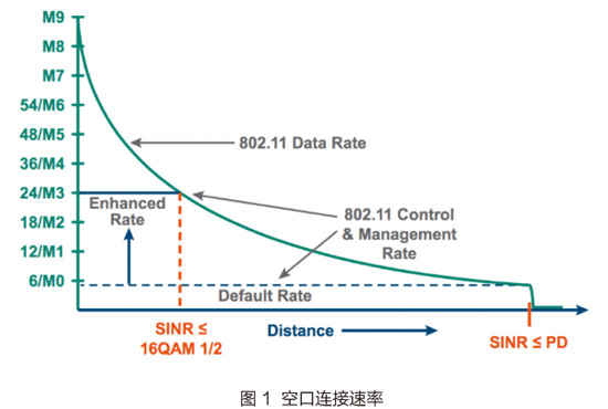 如图1所示,802.11数据帧实际负载的传输速率就是Wi-Fi设备的空口连接速率,这个速率通常与Wi-Fi设备的信噪比有关,随距离增加而降低;802.11管理帧和控制帧则缺省采用最低速率(6Mbps),已确保能够被冲突域中所有的终端有效接收,这一速率可以通过系统参数进行调整到24Mbps,以减少低速率帧对网络性能的影响。