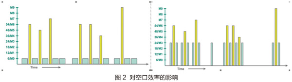 图2抽象地显示出构成相同的802.11管理帧、控制帧和数据帧在采用不同的速率时对空口效率的影响。很明显,第二张图中由于管理帧和控制帧采用24Mbps速率进行发送,因此每一帧可以消耗更少的空口时间,使无线信道更多地处于空闲状态,所以可以提升空口效率,达到性能优化的目的。